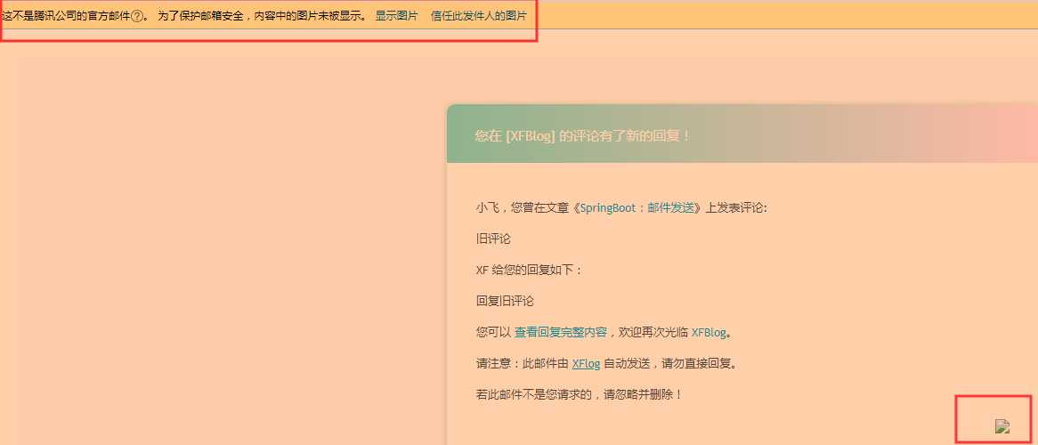 使用SpringBoot发HTML邮件时,图片不能正常显示,原因是腾讯邮箱拦截了。