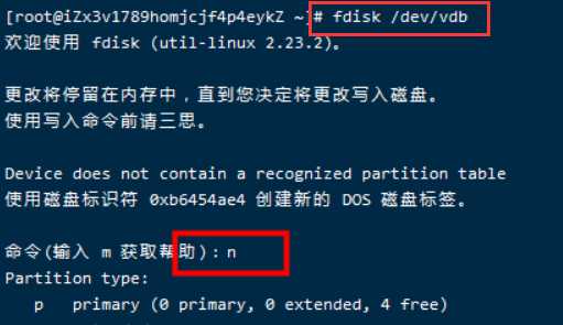 3.1、执行命令fdisk /dev/vdb,进入fdisk模式,开始对新增数据盘执行分区操作。