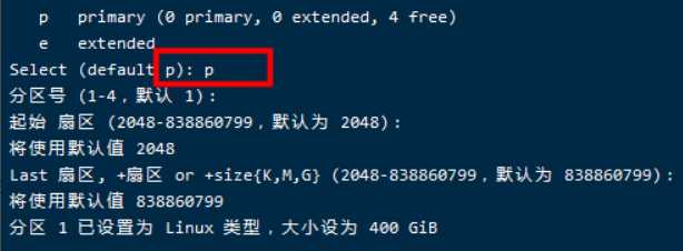 在回显信息中,输入n后回车,接下来的操作全部回车默认即可。在上图中最后回车回显的信息中告诉我们有一个400G的硬盘分区以及建立好了。