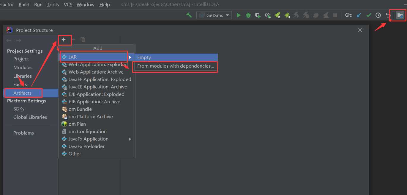 1、选择Project Structure—>Arifacts—>点击+号—>Jar—>Create JAR…