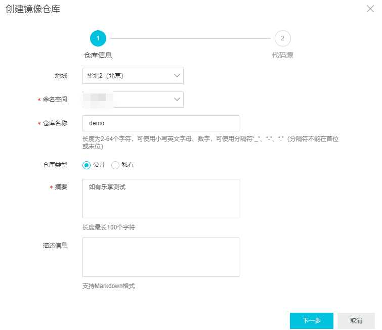 3、新建仓库等!选择我们新建的命名空间!代码源选择本地仓库!