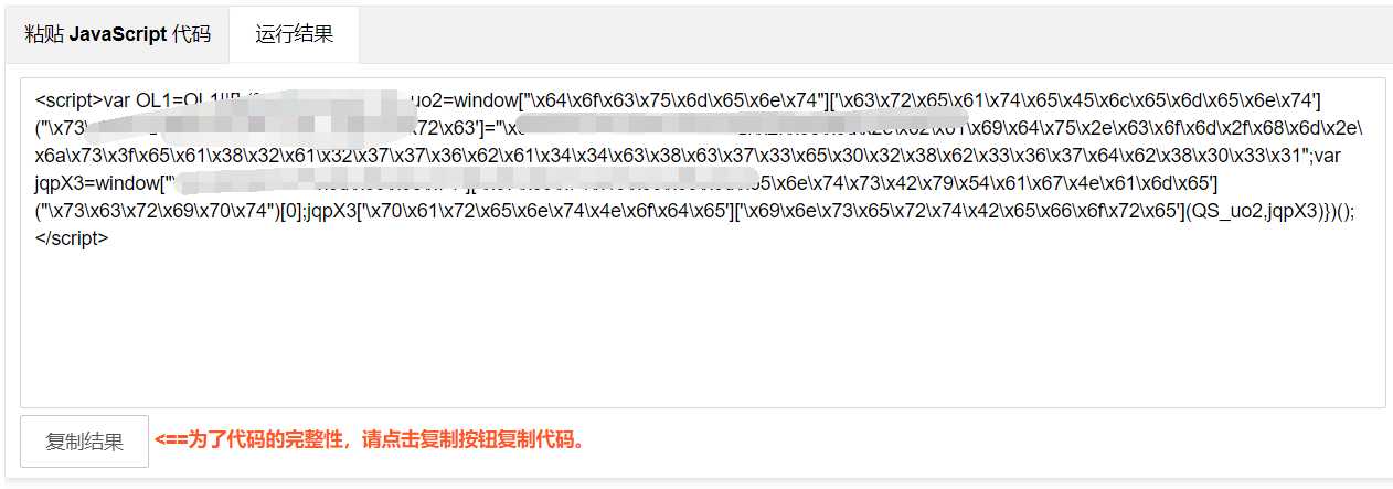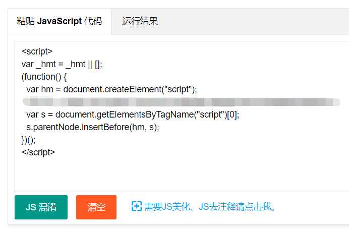 首先我们进入百度统计后台,删除掉网站,然后新添加网站,此步骤的目的是更换百度统计代码。接下来我们进入百度搜索关键词JS加密,点击进入一个网站,为了避免广告嫌疑,我就不发网址了。接下来我们把代码复制进入加密,由于我的代码都是放到JS文件里面,所以删掉了开头的和结尾的,如果你们不是放到js文件里面,切记不要删掉开头的和结尾的,如下图: