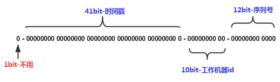 1、第一个部分是 1 个 bit:0,这个是无意义的。因为二进制里第一个 bit 位如果是 1,那么都是负数,但是我们生成的 id 都是正数,所以第一个 bit 统一都是 0。
