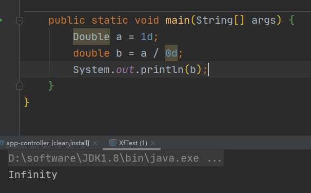 可以看到使用double类型除以0,得到 Infinity(无穷大)。原理是因为java的float和double使用了IEEE 754标准。这个标准规定:浮点数除以0等于正无穷或负无穷。