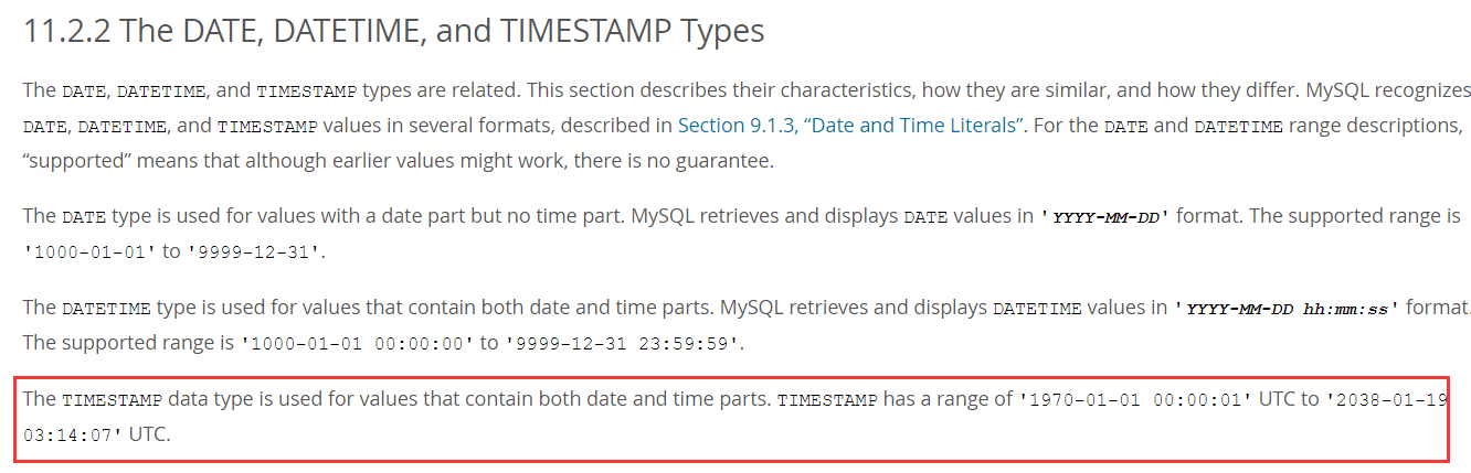 从上面看,你可能会有优先选择使用 TIMESTAMP 来存储时间,简化了SQL。实际这种方式并不推荐,因为 TIMESTAMP 是有有效期截止时间的,TIMESTAMP 最大时间是2038年。如果你的业务时间很可能在2038年还在继续运营,毕竟现在都2021年了。如果你觉得公司业务挺不到2038年,那没关系。当然,如果幸运地挺到2038年,请务必写下一条待办事项:到2038年1月1日前修改数据表时间戳字段类型。