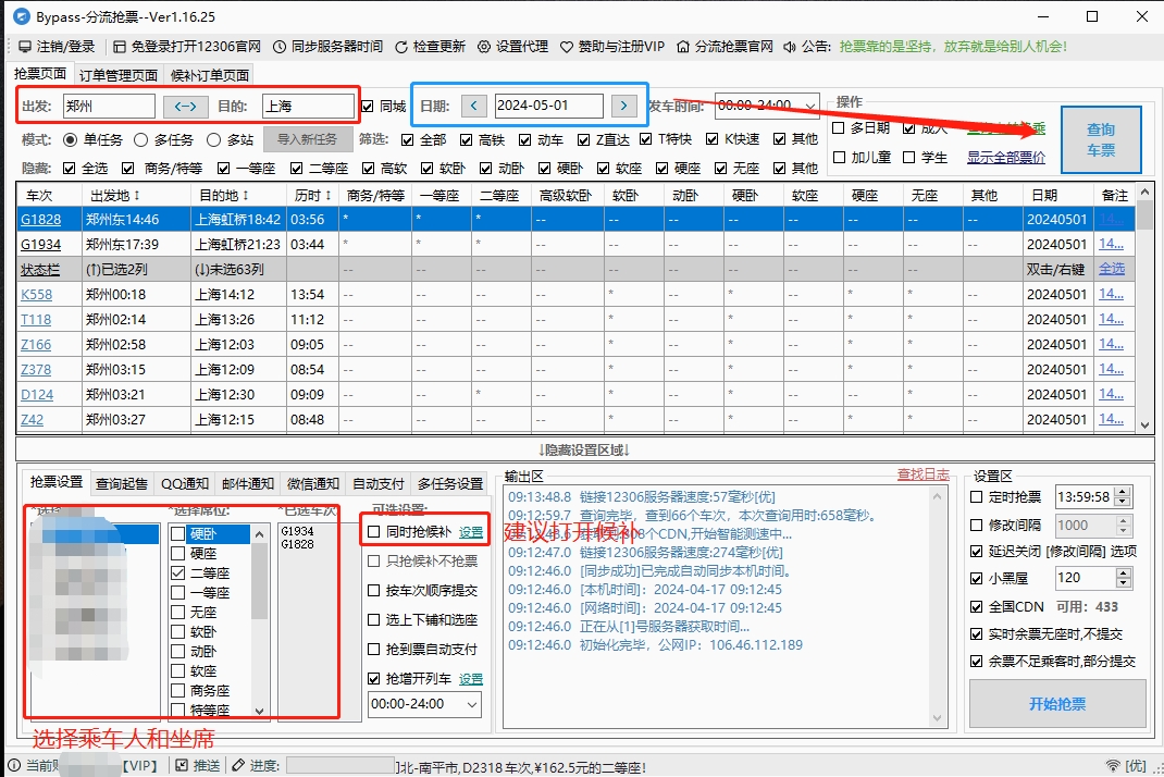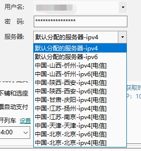 2、用户名和密码就是你自己的12306账号密码,服务器可以选择你所在城市的,如果没有就使用默认的即可!
