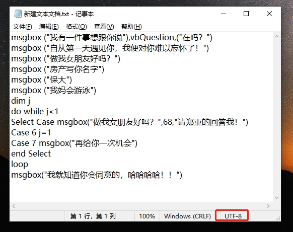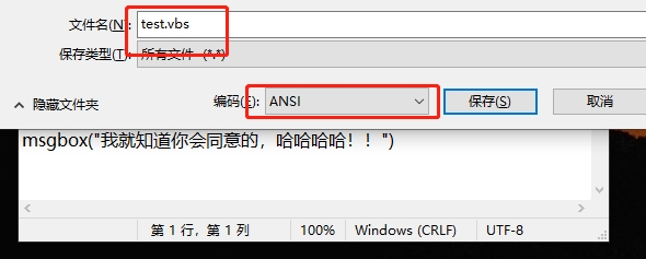 另存为将文件的后缀名改成 .vbs,前面的名字任取,将编码格式改成 ANSI 编码!