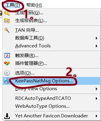 2、在KeePass软件顶部找到工具—》选择KeePassNatMsg