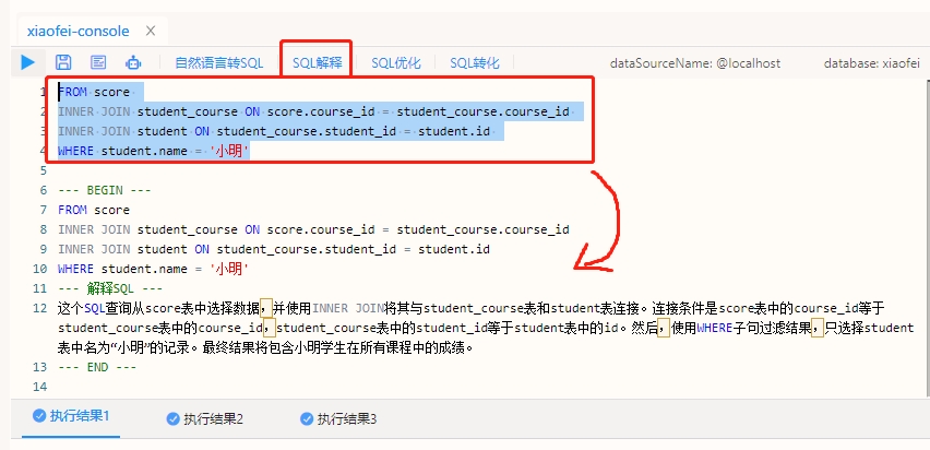SQL解释: SQL语句转中文解释(有的时候我们会遇到非常复杂的SQL,有的甚至成百上千行的SQL,要读懂这段SQL可能需要几个小时甚至几天时间。通过Chat2DB就可以快速的了解这段SQL的含义)