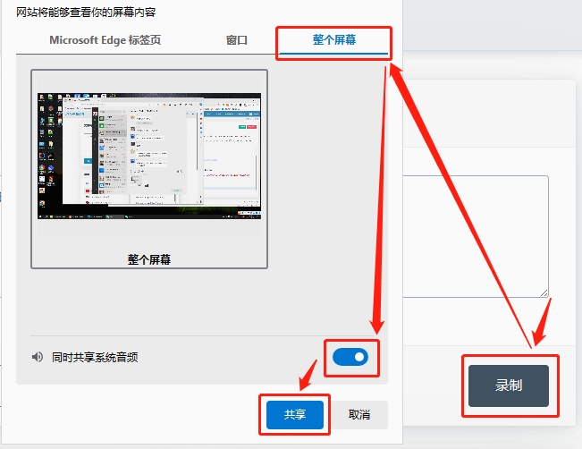 1、输入好文字以后点击录制,然后选择整个屏幕,打开仍共享选项卡音频选项,最后点击共享即可开始录制并下载。