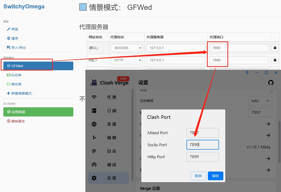 5、点击 GFWed,展开更多,设置前两个选项,找到你的代理软件里面的端口设置,按照图片下方所示填入即可,最后点击左侧的应用选项