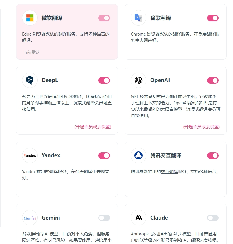 该翻译插件支持超过 10 种翻译服务,如 Deepl、OpenAI、微软翻译、谷歌翻译、腾讯翻译等等,需要选择哪个直接设置好就行