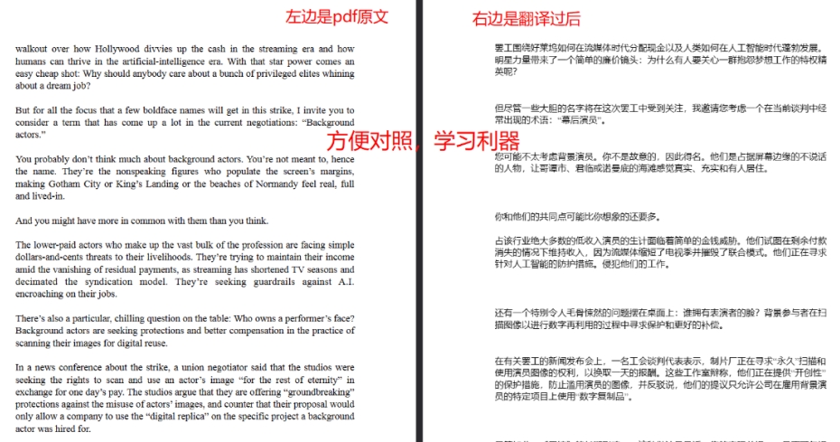 我们鼠标右键沉浸式翻译插件,选择翻译本地PDF文件选项,然后上传PDF文档,就会发现插件可以自动翻译文档,左边为原文,右边为译文,十分方便,简直就是学习的利器