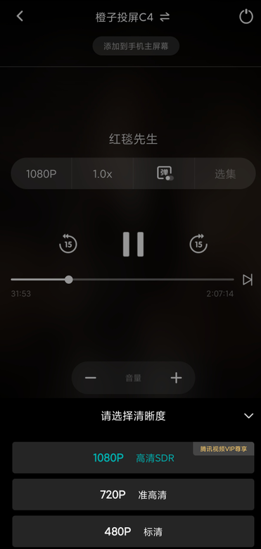 打开某个电影,点击右上角投屏按钮,选择设备即可,支持清晰度选择和倍速、音量等功能!