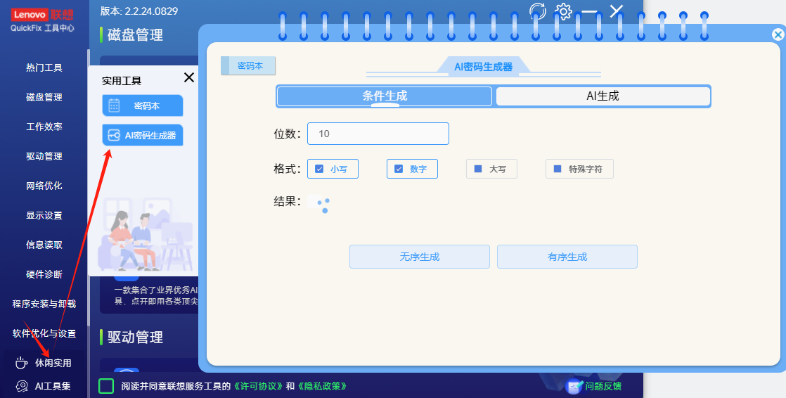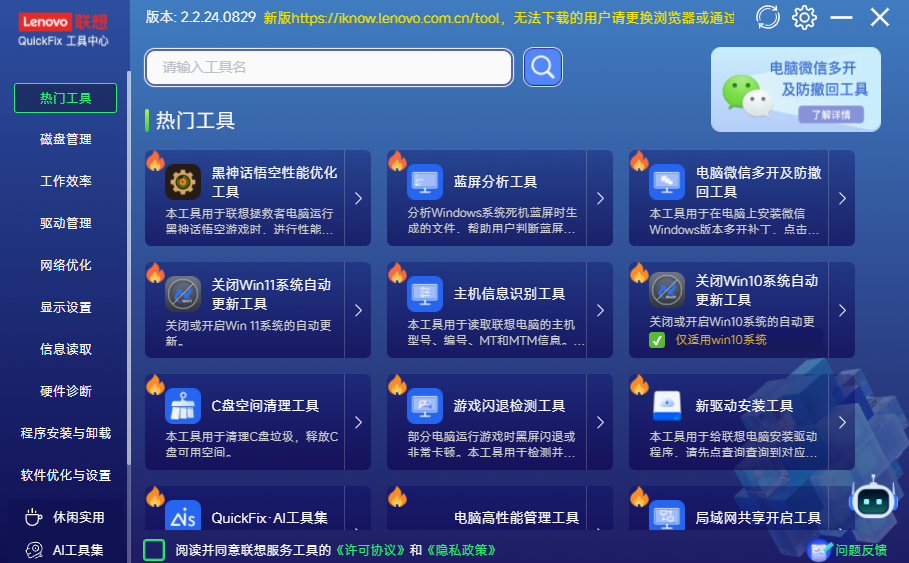 QuickFix工具中心是联想专为电脑维护与管理打造的综合工具平台。它涵盖了磁盘管理、驱动管理、网络优化、硬件检测、程序的安装与卸载、工作效率提升,以及软件优化与设置等多项功能。同时,QuickFix还提供密码本、AI密码生成器和AI工具集,旨在为用户打造一个统一、高效的管理体验。凭借及时更新和全面优化,QuickFix工具无疑体现了联想对用户需求的深刻关注与用心。