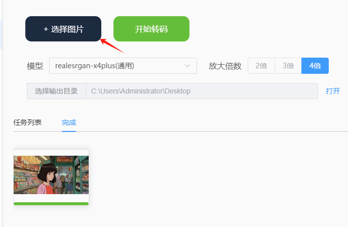 3、使用起来很简单,只需要选择一张图片,导入进去,点击开始「开始转码」即可,等待几秒钟,就会呈现出一个完美的图片。