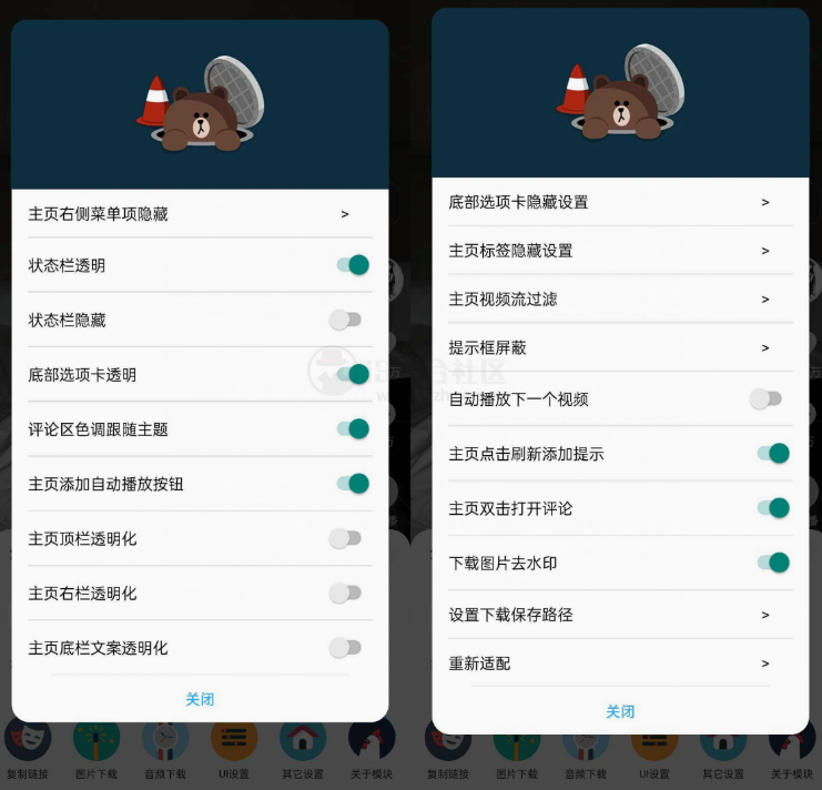 7:隐藏底部选项,隐藏底部加号按钮,手势防触摸,视频右侧控件,视频和弹窗过滤,清爽模式,自动连播,评论区深色模式等