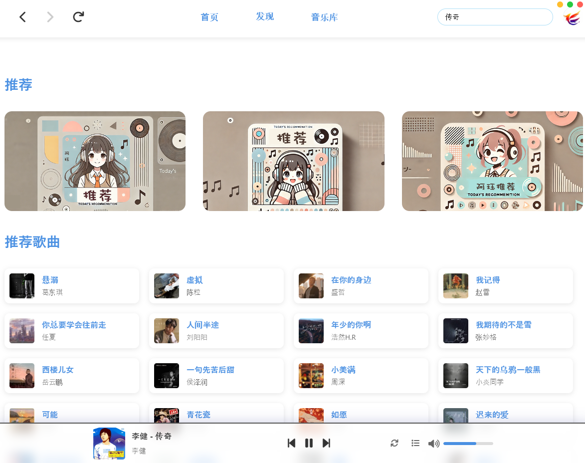 2、它的界面简洁,专注于播放,提供了每日推荐歌曲、搜索等功能,同样没有社交、播客、听书等无用功能,只为给你一个纯粹的音乐享受空间。