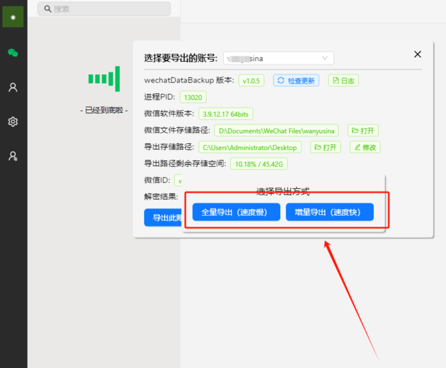 要先在电脑上登录微信哦,登录好了之后呢,再把WechatDataBackup备份软件打开。要是这个软件是第一次安装好然后打开的,它就会提醒你选择一个导出方式,要么是【全量导出】,要么是【增量导出】。