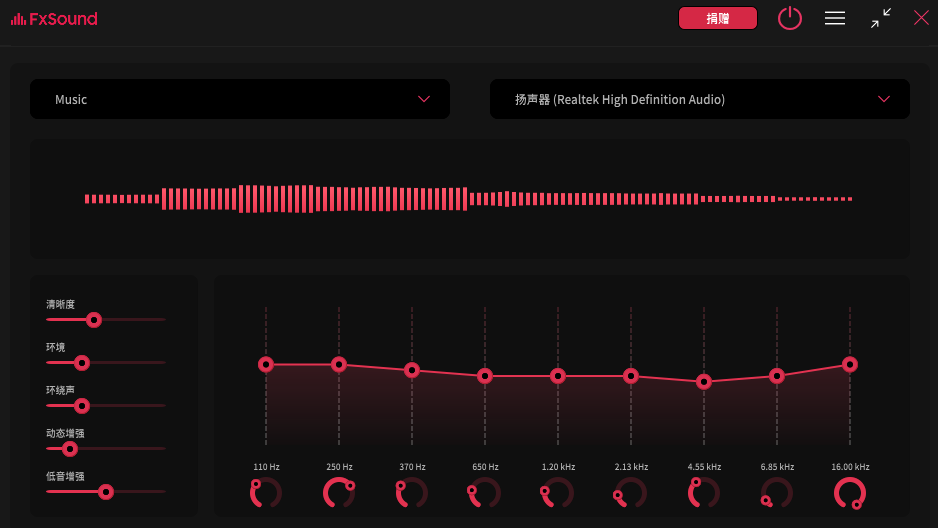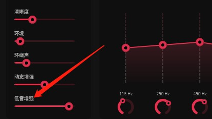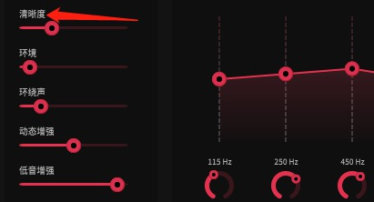 打开软件后,你可以在左边调整各项参数的大小,如清晰度、环境声、环绕声、以及重低音,适合小白用户,右边是均衡器,适合专业的调音人员。
