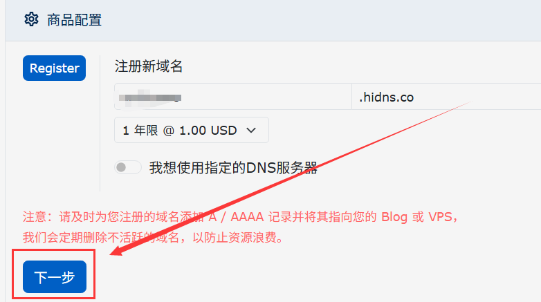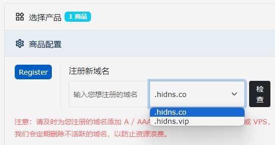 2、填写你需要的域名前缀,选择后缀,并点击检查按钮。未提示报错说明该域名未被占用。