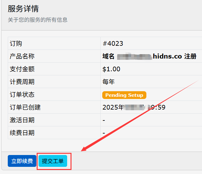 4、返回HiDNS主页,即可看到最近的订单,进入您最近的订单点击提交工单。
