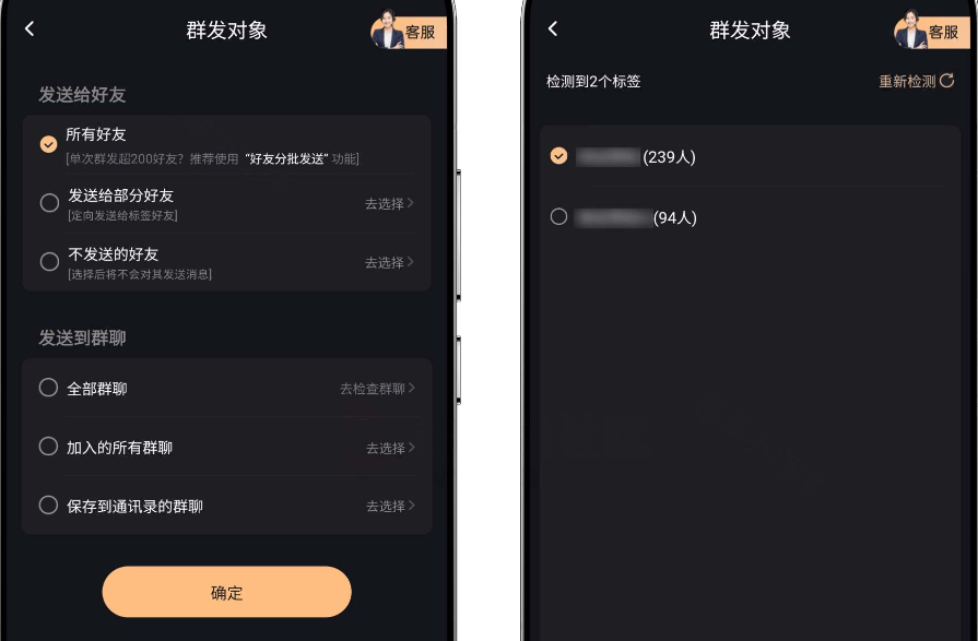 比如群发对象可以设置发送全部好友、发送给部分好友、不发送的好友。可以选择发送给某个标签的好友,还支持发送到群聊。