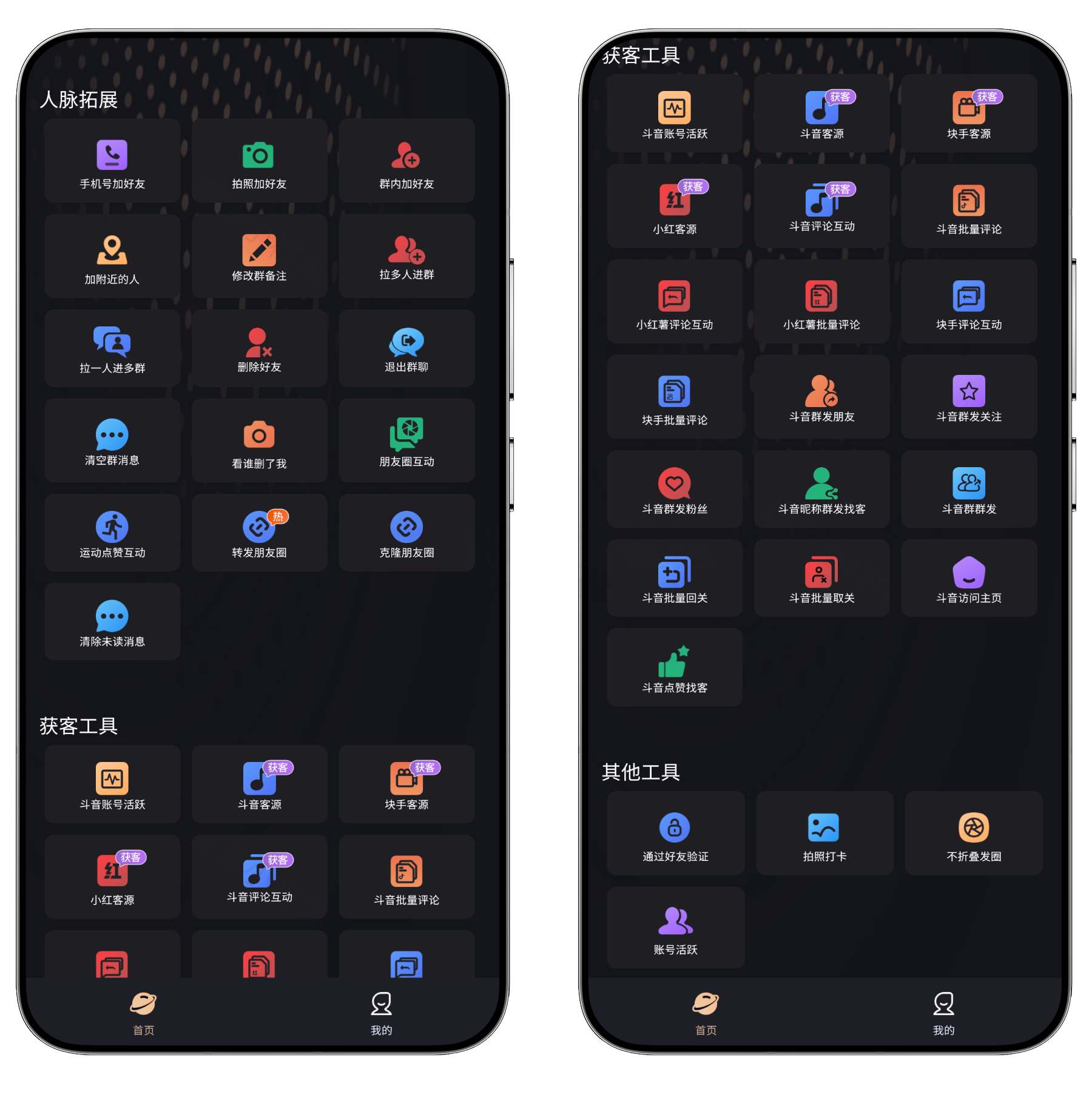在首页下方还有更多的功能,譬如拍照加好友、群内加好友、拉好友进群、查看被谁删除了、不折叠朋友圈、某音/小红薯账号运营等。功能太多了,请直接看下图。