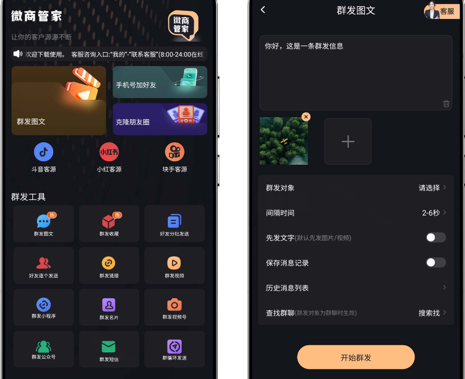 微管家不仅是一款工具,更是微商、社交电商从业者及自由职业者的得力助手。它以强大的功能和便捷的操作,助力用户在激烈的市场竞争中脱颖而出。在信息传播方面,微管家支持多种格式内容的群发,涵盖文字、图片、视频、收藏、链接、公众号、小程序、名片等。一键操作即可精准触达目标客户,无论是新品推广、促销活动,还是日常客户关怀,都能高效完成,大大节省时间和精力。此外,微*管家还具备诸多实用功能。它能精准识别并清理已删除或拉黑的好友,一键转发朋友圈内容,无需繁琐操作,提升内容分享效率。
