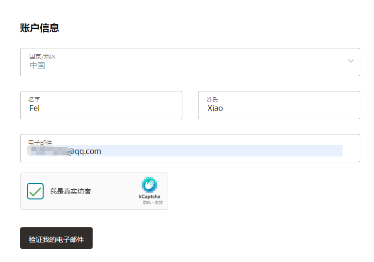 1、选择中国,填写自己真实名称,用英文。填写一个QQ邮箱。