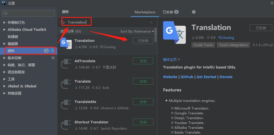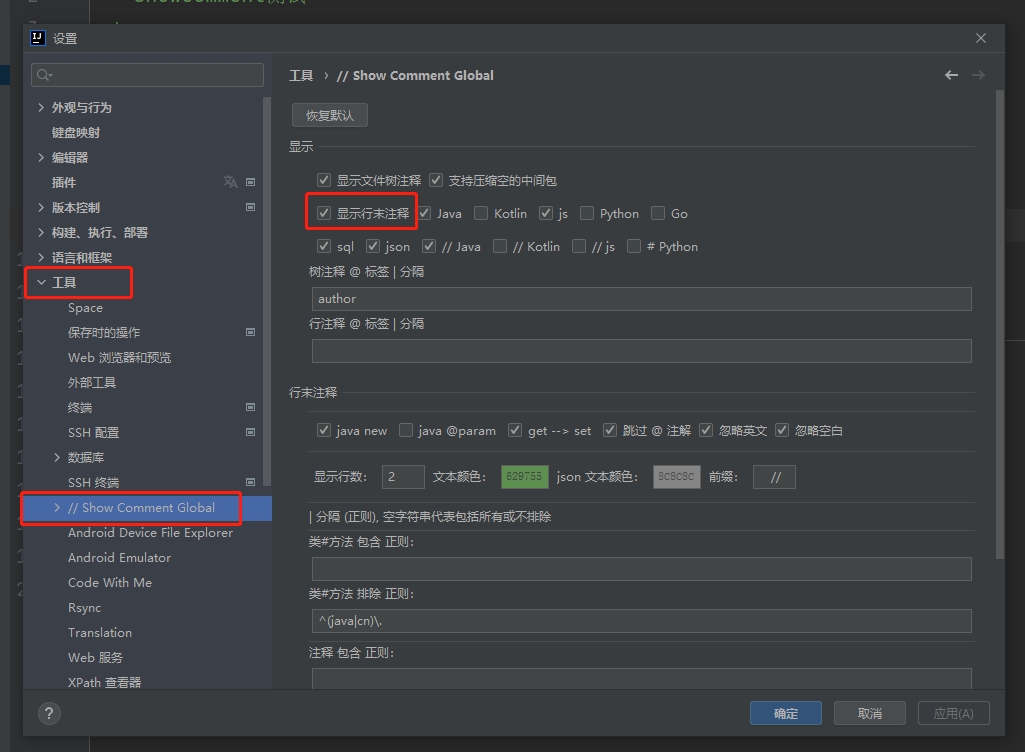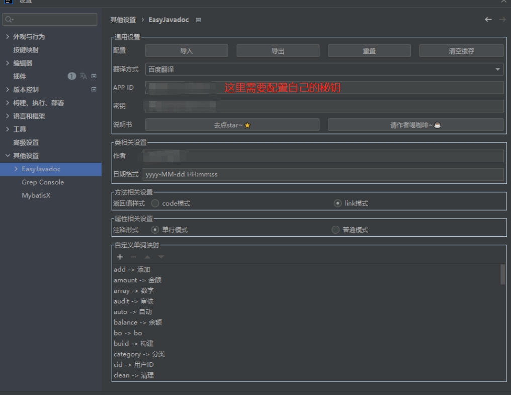 可以对文档注释中的作者名、日期格式等进行相关设置,还可以设置翻译渠道(如百度翻译、有道翻译等)