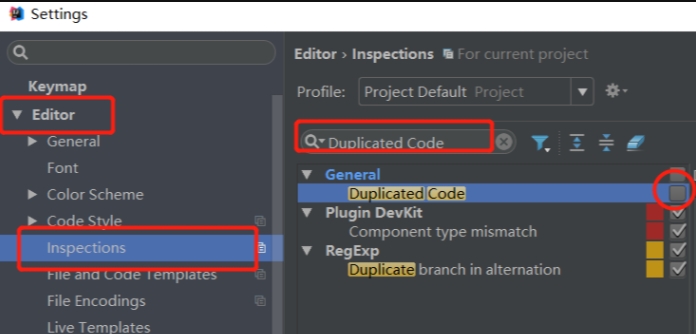 File -> Setting ->Editor->Inspections ->搜索 Duplicated Code 设置为不打勾√即可。
