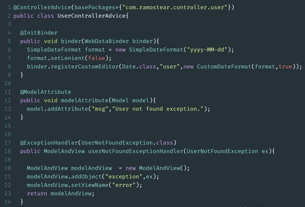 @ControllerAdvice是@Component注解的一个延伸注解,Spring会自动扫描并检测被@ControllerAdvice所标注的类。@ControllerAdvice需要和@ExceptionHandler、@InitBinder以及@ModelAttribute注解搭配使用,主要是用来处理控制器所抛出的异常信息。首先,我们需要定义一个被@ControllerAdvice所标注的类,在该类中,定义一个用于处理具体异常的方法,并使用@ExceptionHandler注解进行标记。此外,在有必要的时候,可以使用@InitBinder在类中进行全局的配置,还可以使用@ModelAttribute配置与视图相关的参数。使用@ControllerAdvice注解,就可以快速的创建统一的,自定义的异常处理类。